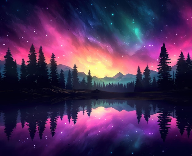This image, generated by an AI algorithm, features a neon-lit landscape that's both futuristic and dreamlike.